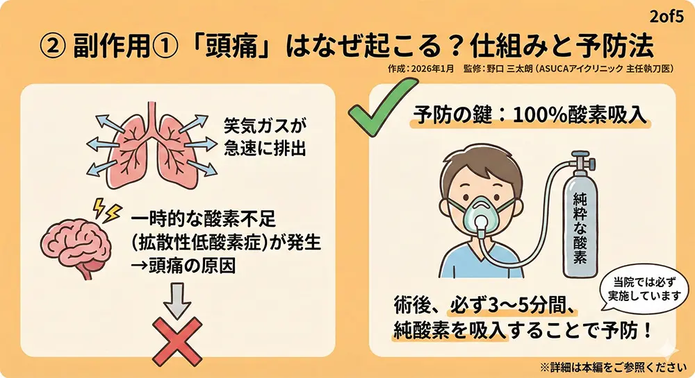 笑気ガスの吸入をやめた直後、体内に残った笑気ガスが一気に肺から出ていきます。このとき、一時的に体に届く酸素の量が減ることがあります(専門用語で「拡散性低酸素症」といいます)。これが頭痛の原因になることがあります。