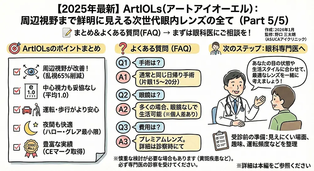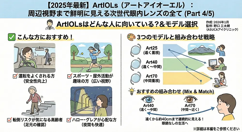 白内障手術をお考えの方、または手術後に見え方でお悩みの方に向けて、ArtIOLsという新しい眼内レンズについて、できるだけ分かりやすくご説明します。難しい言葉は避け、「どんなメリットがあるのか」「どんな方に向いているのか」に焦点を当てています。