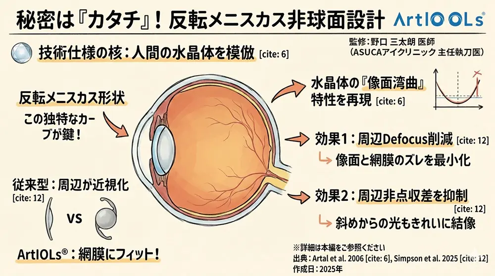 Simpson博士らのレビュー(2025年)では、ArtIOLsを含む先進的IOL設計について、像面湾曲の制御が周辺視野改善の鍵であることが理論的に解説されています[12]。