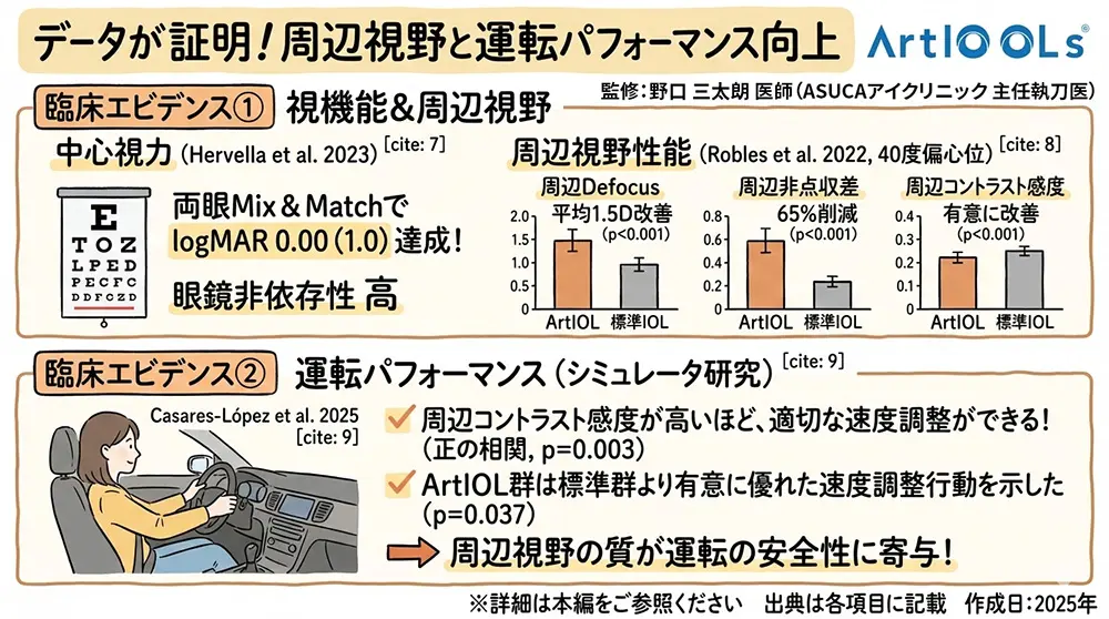 Robles博士らの研究(2022年)では、ArtIOL25を移植した87眼と標準単焦点IOLを移植した51眼を比較し、40度偏心位における周辺光学性能を測定しています[8]。