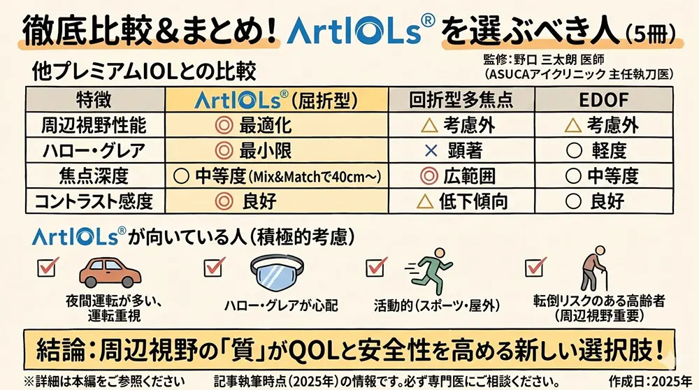 夜間の光のにじみに敏感な方、夜間運転が多い方には、ArtIOLsの方が適している可能性があります。