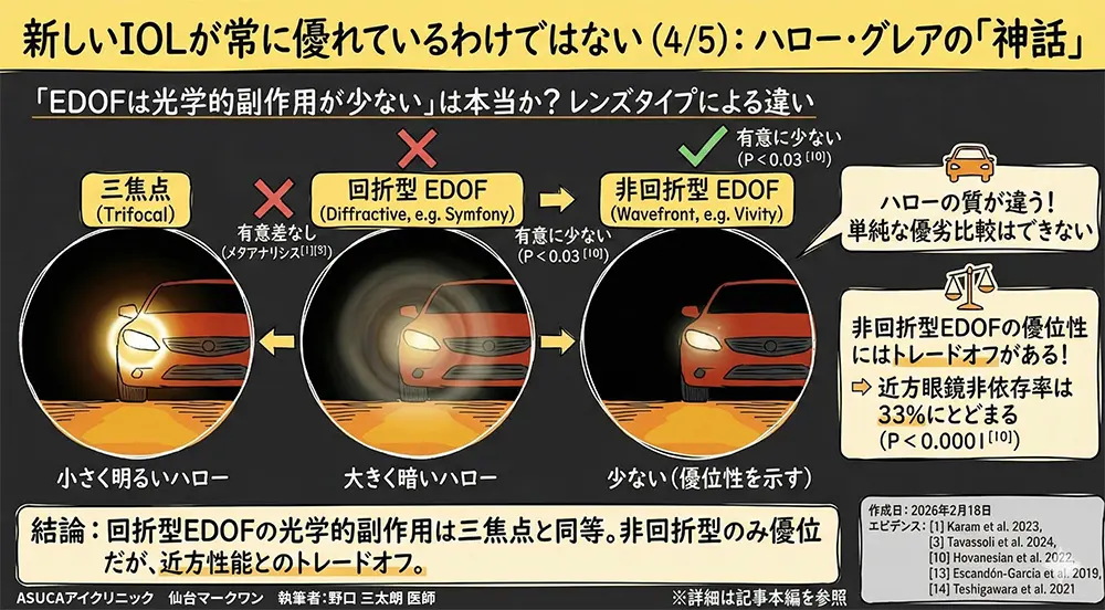 - 🔍 2024年のCochrane系統的レビュー(最も厳格な医学評価):ハロー・グレアに臨床的に意味のある差なし[3]