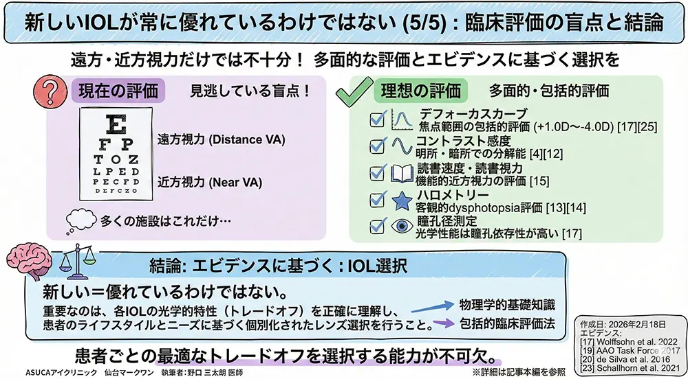 臨床評価の観点からは、遠方・近方2点のVA測定のみに依存する現行の多くの施設の評価法は、IOLの光学的特性の大部分を見逃している[17][20][25]。デフォーカスカーブ、コントラスト感度(明所・暗所)、ハロメトリー、読書速度を含む包括的多面的評価の標準化と普及が急務である[19][23]。IOLの「世代」や「テクノロジー名」ではなく、標準化されたプロトコルに基づく客観的光学データによってレンズを評価し、患者のライフスタイルとニーズに基づく個別化されたレンズ選択を行うことが、真のevidence-based practiceである。