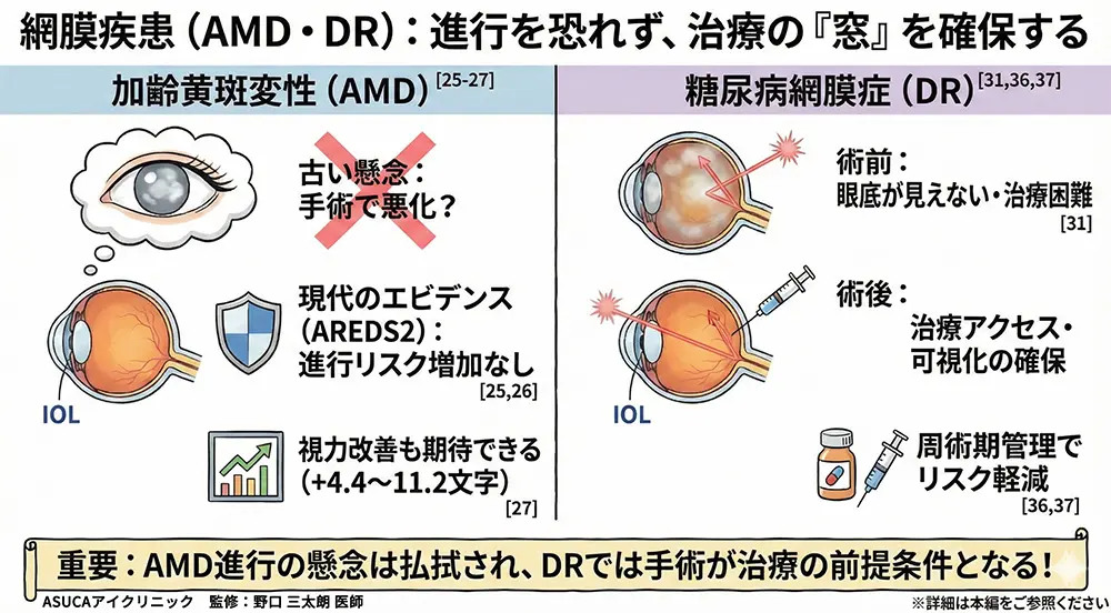 米国国立眼研究所(NEI)は「AMD悪化への懸念から白内障手術を回避・遅延させる必要はない」と公式に声明を出しています[26]。