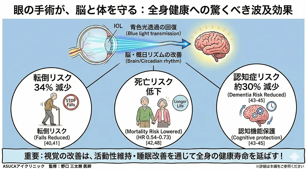 - 白内障手術には視力改善以外の大きなメリットがあります。眼圧低下(緑内障治療効果)[16,17]、転倒34%減少[40]、認知症リスク29%低下[43]、死亡率27〜46%低下[42,48]。