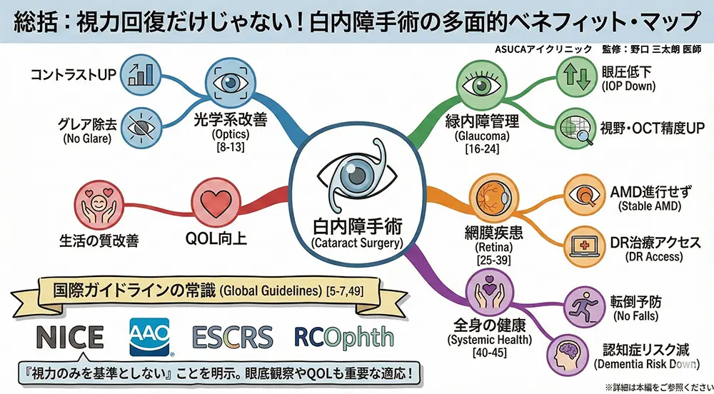 | ESCRS(2025年9月) | 「白内障手術は緑内障、DR、AMDの管理を促進」。認知健康効果を認定。 | GRADE +/++ | [7] |