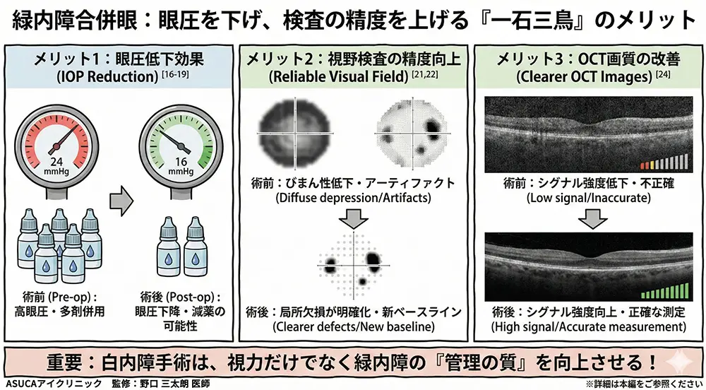 白内障があると、医師が目の奥(眼底)を詳しく観察することが困難になります。白内障手術により眼底観察が容易になり、緑内障の管理全体が正確になります。