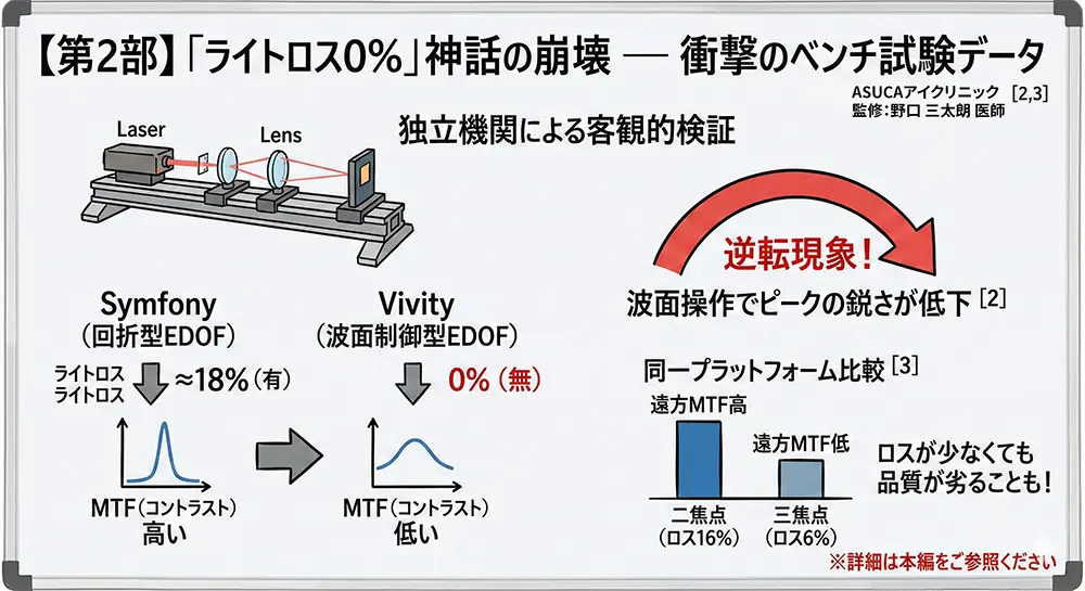 第二に、独立オプティカルベンチ試験は、ライトロス0%のIOLがライトロス18%のIOLよりも低いMTFを示す「逆転現象」を繰り返し報告している。同一プラットフォーム比較ではライトロス6%の三焦点がライトロス16%の二焦点より遠方MTFが低い[2,3]。