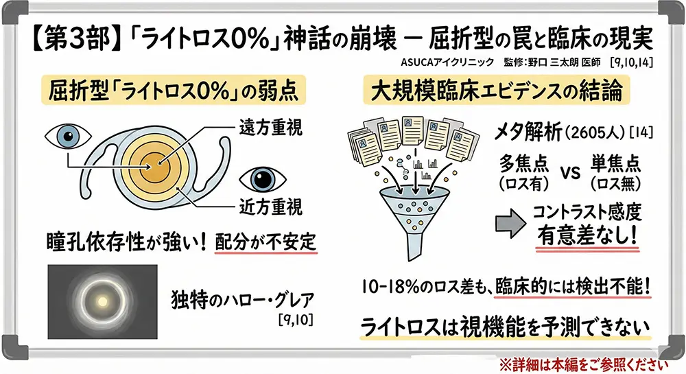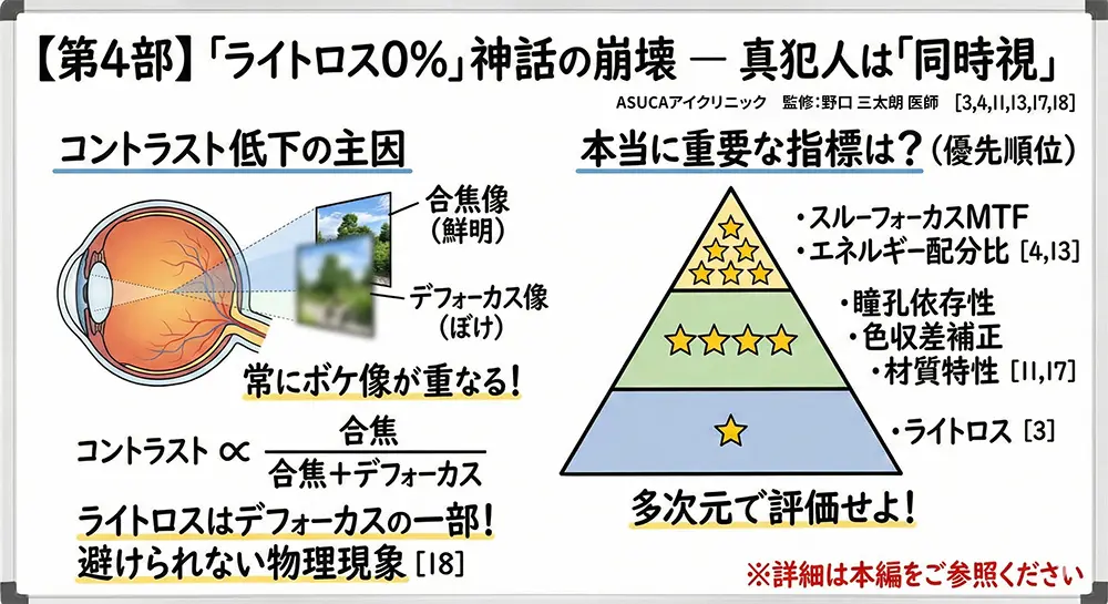 この結果が意味するところは深遠である。もし「ライトロス」が視機能の支配的因子であるならば、10~18%の光を遠方以外に分散する多焦点IOLは、単焦点IOLに対して臨床的に検出可能なコントラスト感度低下を示すはずである。しかし、2,605人規模のメタ解析でそのような差は検出されなかった。ライトロス数%の差が臨床的に意義を持つという主張は、より大きなコントラスト差(10~18%の光再配分)ですら臨床的に検出困難であるという事実の前に瓦解する[14]。