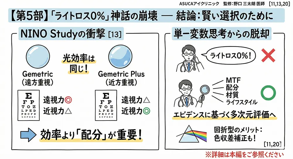 第四に、同一光効率・異配分IOLの前向き比較(NINO study)が、視機能を決定するのは総合効率ではなくエネルギー配分戦略であることを明確に証明した[13]。
